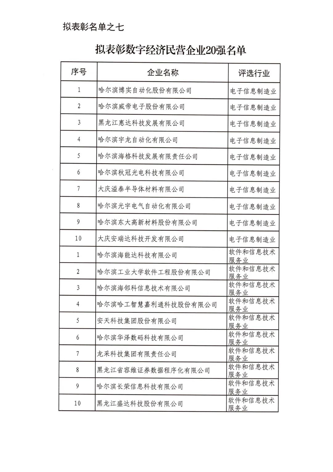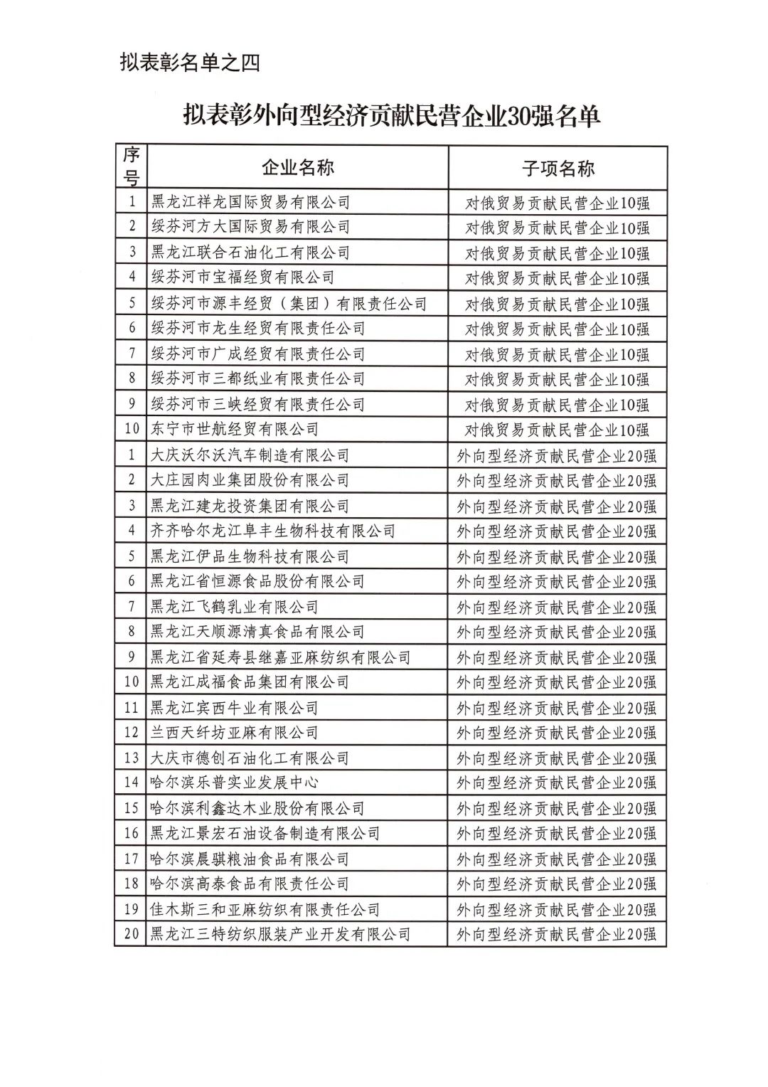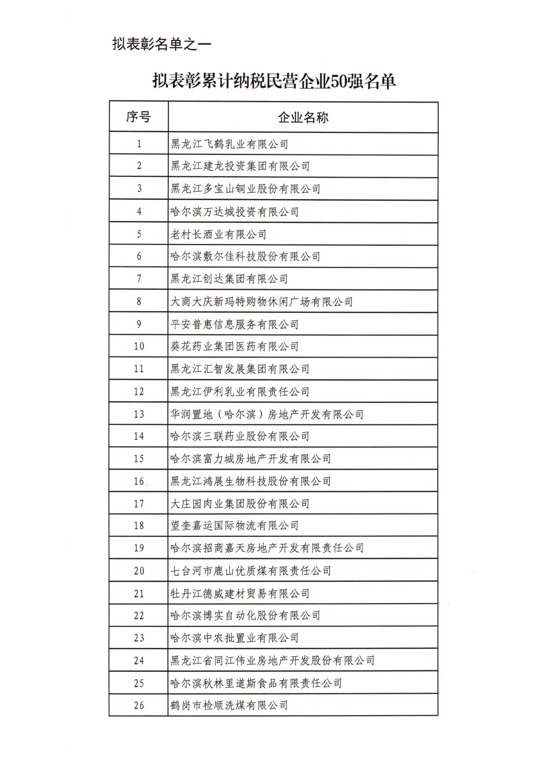 按照省委省政府關于召開全省民營經濟大會的決策部署要求,擬對全省優秀民營企業進行表彰。經企業自愿申報、市(地)把關推薦,評審小組排名,征求相關部門意見等程序,擬表彰全省累計納稅民營企業50戶、就業突出貢獻民營企業20戶、民營高新技術企業50戶、外向型經濟貢獻民營企業30戶、龍江質量品牌優秀民營企業50戶、生物經濟民營企業20戶和數字經濟民營企業20戶。現將擬表彰名單予以公示。